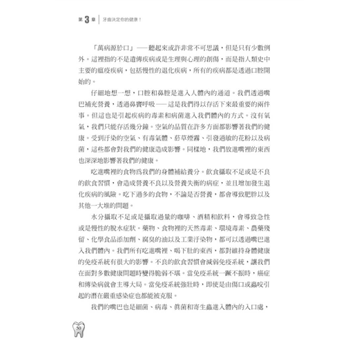 如果你有呼吸不順、齒齦出血、蛀牙或牙疼的情形-你會需要這本書!如果你苦受氣喘、糖尿病、關節炎、偏頭痛或是任何慢性疾病的侵擾卻手足無措的話,本書肯定能提供你所需的解決之道。
