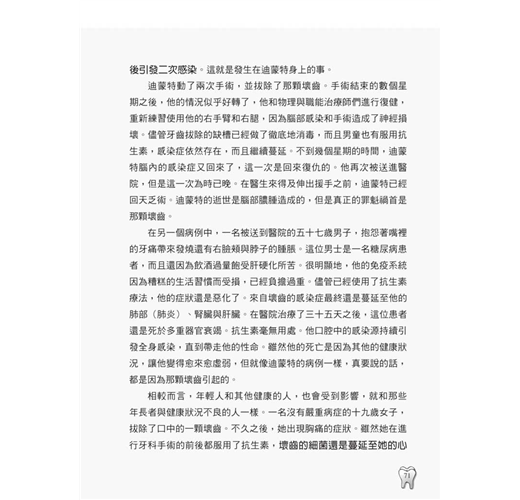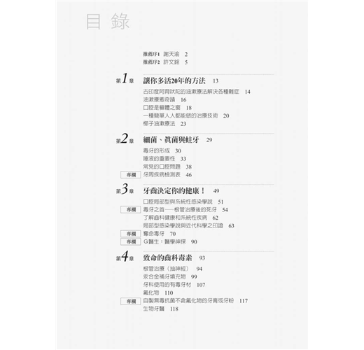 2. 此修訂版,補充了台灣讀者使用後改善的案例,以及德瑞森自然醫療中心 謝嚴谷小姐編整的口腔病菌與齒科毒素之全身感染彩圖拉頁,讓口腔與健康之間的因果關係更清楚明確的呈現給讀者們知道。
