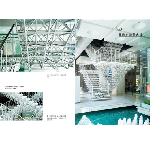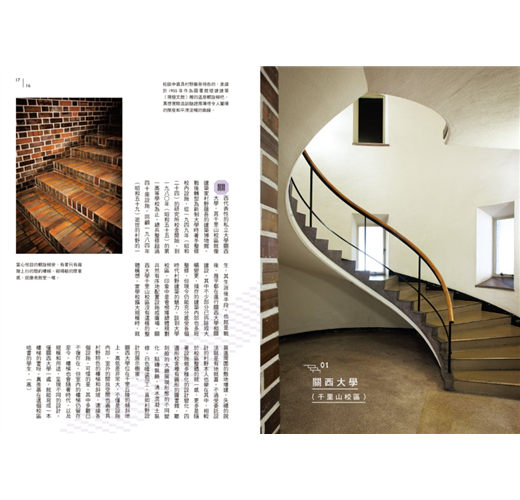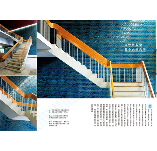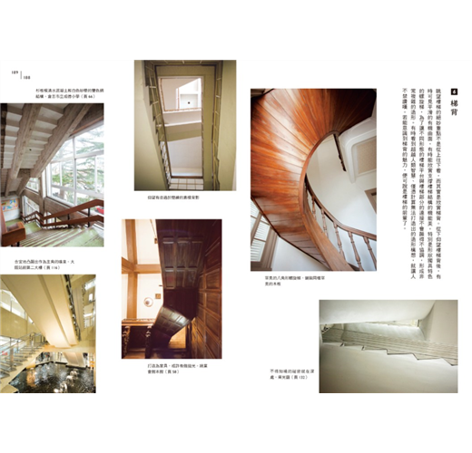 ․樓梯名家設計之道:普立茲克獎得主丹下健三;安藤忠雄之前的關西一代建築大師村野藤吾;日本代謝派大師菊竹清訓;師承柯比意的前川國男、坂倉準三、吉阪隆正;旅日美國建築家一柳米來留;百年歷史的日建設計建築師林昌二……廣泛收錄樓梯名作,部分作品未開放一般參觀,部分作品或將改建不復存在。