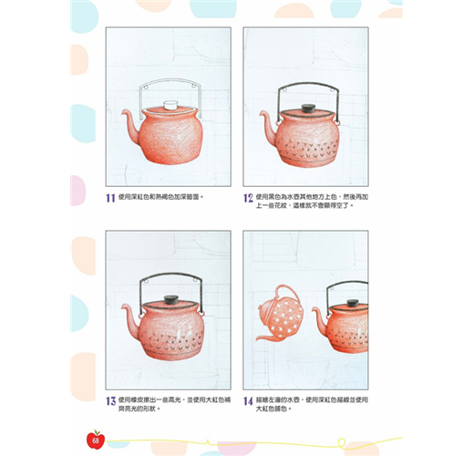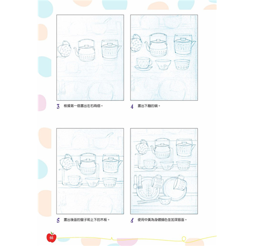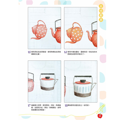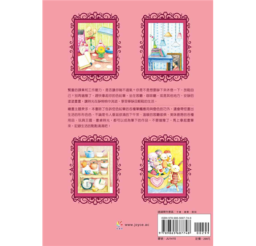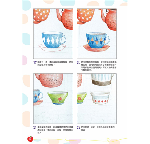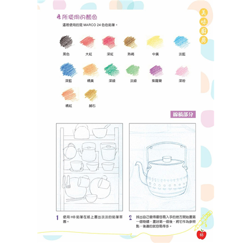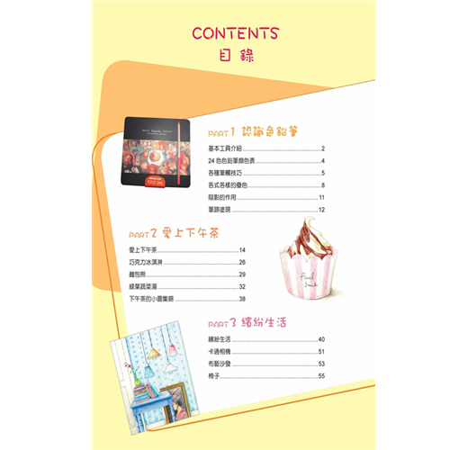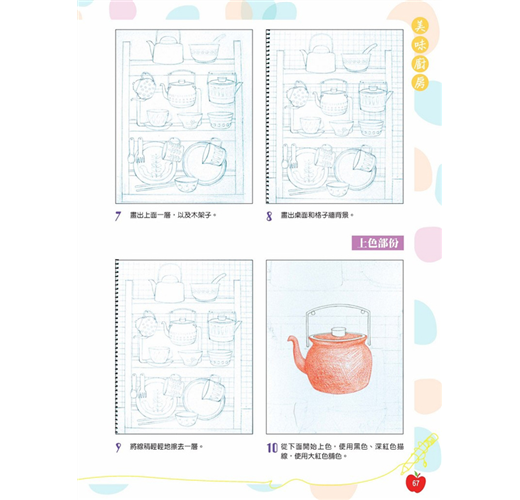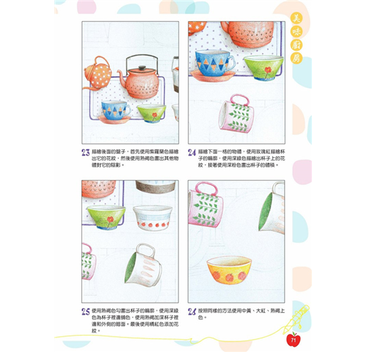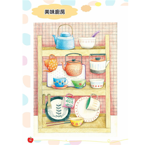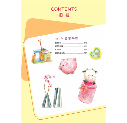 繪畫主題眾多,本書除了告訴您色鉛筆的各種筆觸應用與疊色技巧外,還會帶您畫出生活的形形色色。不論是令人垂涎欲滴的下午茶、溫暖的客廳家俱、美味廚房的各種用品、玩具王國、書桌時光,都可以成為筆下的作品,不要猶豫了,馬上拿起畫筆來,記錄生活的點點滴滴吧!