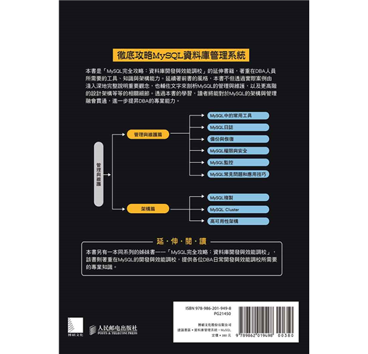 本書是「MySQL完全攻略:資料庫開發與效能調校」的延伸書籍,著重在DBA人員所需要的工具、知識與架構能力。延續著前書的風格,本書不但透過實際案例由淺入深地完整說明重要觀念,也輔佐文字來剖析MySQL的管理與維護,以及更高階的設計架構等等的相關細節。透過本書的學習,讀者將能對於MySQL的架構與管理融會貫通,進一步提昇DBA的專業能力。
