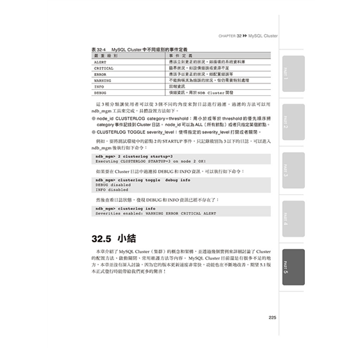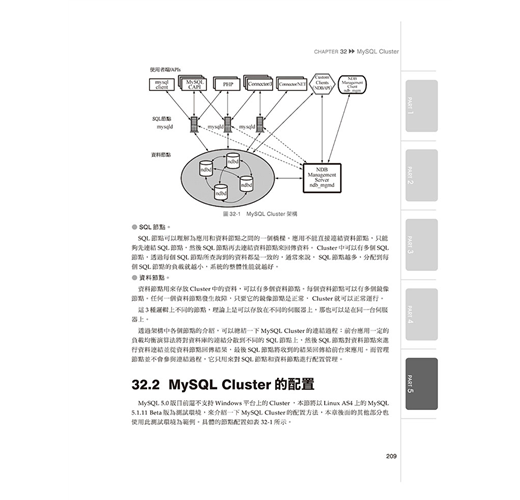 2. 「架構篇」:主要針對專業資料庫管理人員和專業資料庫架構設計師,包括MySQL複製、MySQL Cluster、高可用性架構等內容。透過這部份內容的學習,讀者可以瞭解MySQL的一些高級應用方法。