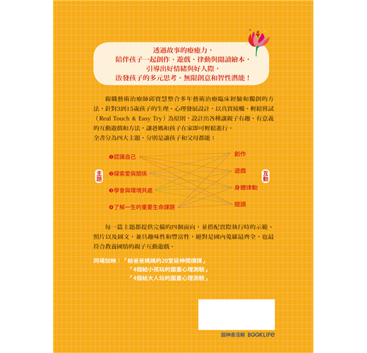 本書分為四大主題,分別是讓孩子和父母都能:1認識自己,2探索愛與關係,3學會與環境共處,4了解一生的重要生命課題,每一篇主題都提供完備的創作、遊戲、身體律動、閱讀四個面向,並搭配實際執行時的示範、照片以及圖文,兼具趣味性和豐富性,絕對是國內蒐羅最齊全,也最符合教養國情的親子互動遊戲。