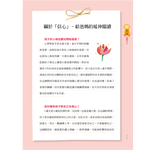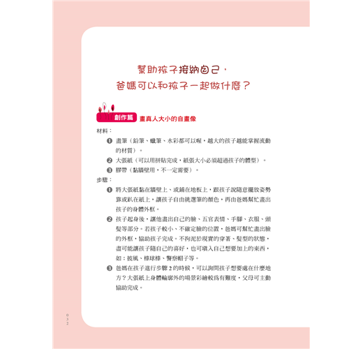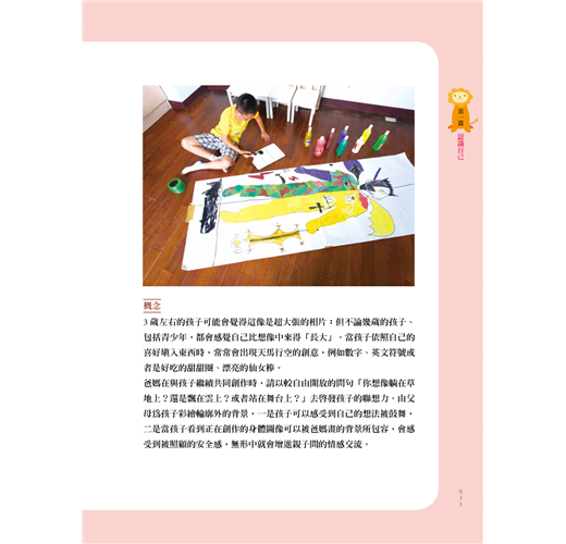 驚喜與解惑在這段期間不斷收獲;但不安與愧疚的心情更常此起彼落。如果,我更早些察覺,或許有些孩子或家庭能在與我的工作中得到更多。因此,我在書中對於每個創作、遊戲、律動或繪本的使用和效果都特別加以說明,才能夠達到此書培養孩子透過學習經驗、環境條件去強化心理素質的目的;尤其因應在不同個性的孩子上可能需要注意的重點,希望透過清楚的經驗分享,使爸媽在與孩子輕鬆的互動之中,亦能教學相長,營造更正向的親子關係。謝謝一起工作過的孩子與家長們等我成長,給我機會彌補過去的撞牆期;這使我更珍惜現在的生活,也更支持我助人的夢想,我始終相信即使是從挫折中學到的經驗也都是值得的。