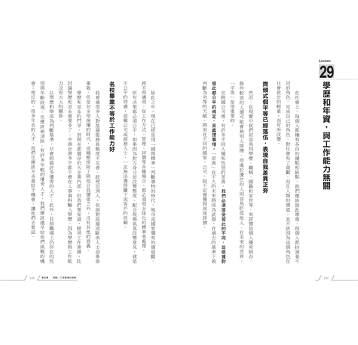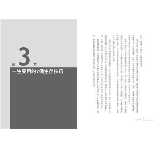 本書希望和各位分享,在充滿競爭力的環境下,現代人應該具備的工作態度和生存技巧,也就是說,在這個充滿變數又高競爭力的職場,要如何才能生存下去的「新工作準則」。