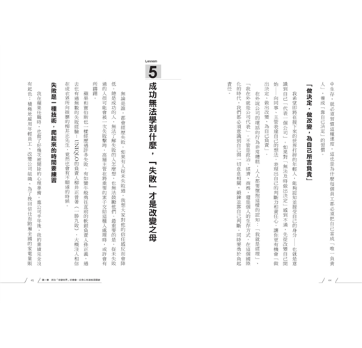 ◎應對變化:養成馬上就站起來的「受挫力」除了創造變化之外,在真正全球化的世代中,你必須具備「應對變化」的快速適應力。在一切講求效率與速度的時代,「深思熟慮」或許能避免犯錯、做出最好的決定,但卻很有可能讓你錯失先機;想和全世界競爭,要能在短時間內做出重要的決定,因此平時就要累積足夠的「資訊」,才能迅速做出判斷。