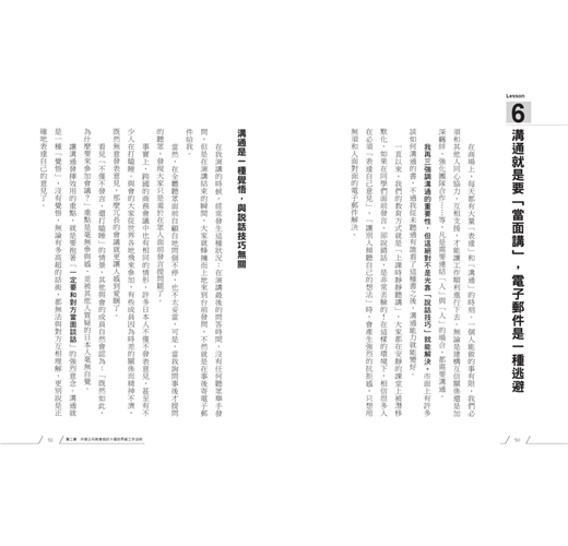 ◎敢說敢問,養成對誰都敢開口的厚臉皮現在除了電子郵件外,各種方便又免費的通訊軟體,也成了「溝通」的工具,但是,正因如此,現代人「面對面」溝通的能力明顯降低,特別是在「傳達壞消息、致歉、不得不毀約、有所求……」等,這些不知道該如何開口的狀況時。電子郵件可以將解決問題的過程留下紀錄,但若是需要溝通的人近在咫尺、選擇用電子郵件只是為了避免當面談話時,這項便利的工具反而成為一種弊害。若連「面對面溝通、解決問題」都無法做到,若是發生其他問題時,也沒辦法正面解決。