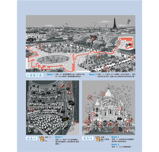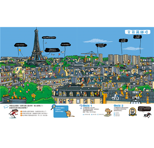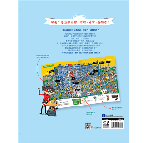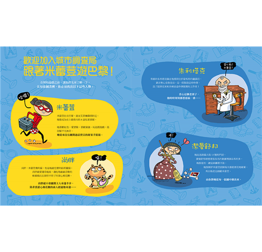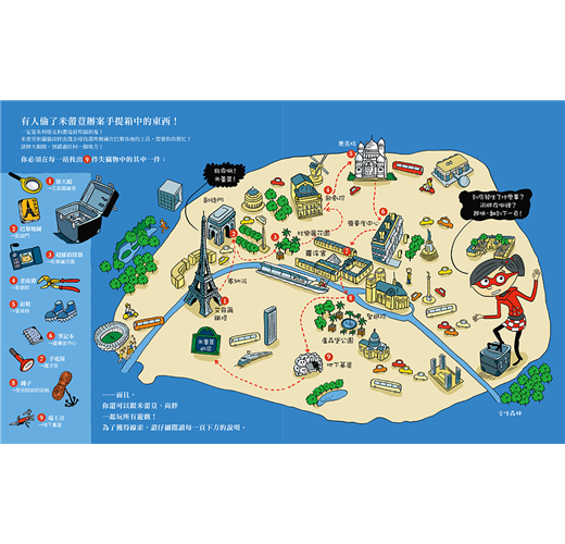 這是一本集合故事情節、幽默歡笑、精美鮮豔圖畫、豐富知識與滿滿創意的繪本,除了刺激有趣的偵探推理故事之外,還能一邊吸收巴黎名勝相關知識,每一頁都藏著許多好玩的互動小遊戲!