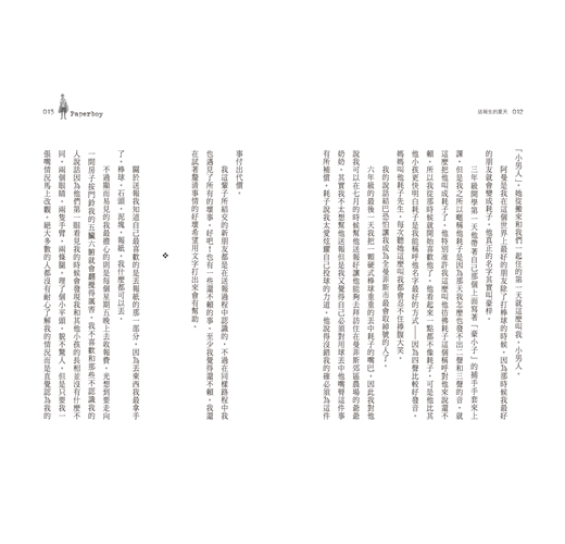 而這一切在他十一歲時替朋友送報的那個夏天,變得不一樣了。透過送報他結交到很多朋友,最後他雖然沒有完全克服結巴,卻領悟到非常重要的一件事,那就是一個人說什麼,比他怎麼說更重要!他雖然說話結巴,但是靈魂沒有結巴!至於他在那個夏天究竟發生了什麼特別的事、遇上了什麼樣的人,就請您自己來發現嘍!