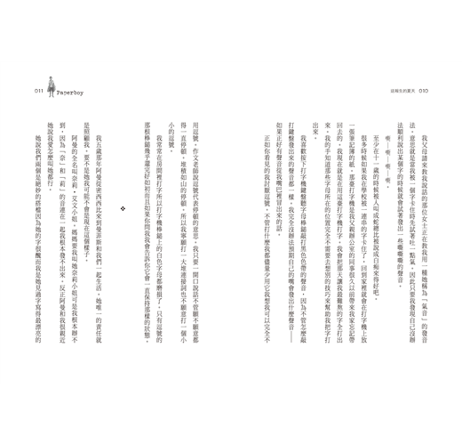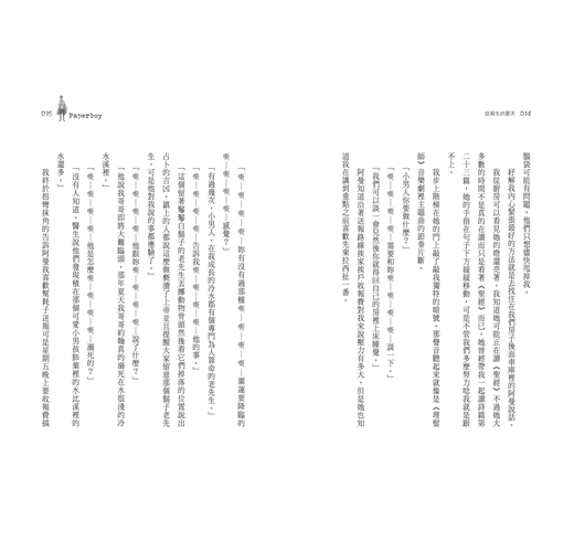 猶記得收到書稿的那天,翻開第一頁,看到滿滿的一段話,卻只有少少的標點符號,我心想:「這編輯也太不用心了,沒有逗點很難閱讀啊!怎麼不把標點符號加好,再送過來呢?」但跟著小男人的腳步讀下去,我很快就懂了,這是作者刻意營造的狀態和氛圍,隱含著他對溝通的深刻觀察。