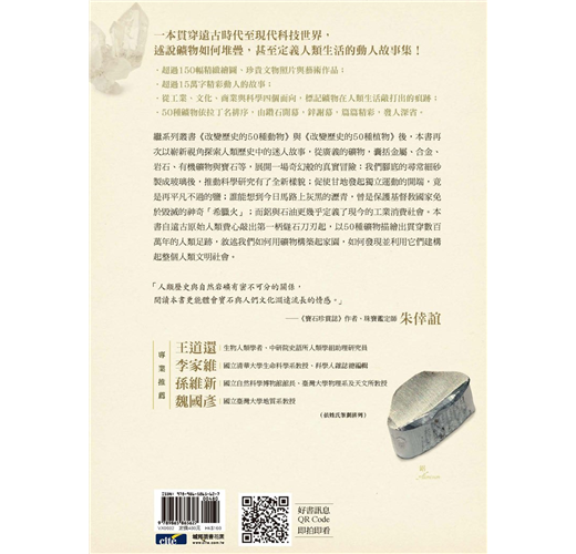 繼系列叢書《改變歷史的50種動物》與《改變歷史的50種植物》後,本書再次以嶄新視角探索人類歷史中的迷人故事,從廣義的礦物,囊括金屬、合金、岩石、有機礦物與寶石等,展開一場奇幻般的真實冒險:我們腳底的尋常細砂製成玻璃後,推動科學研究有了全新樣貌;促使甘地發起獨立運動的開端,竟是再平凡不過的鹽;誰能想到今日馬路上灰黑的瀝青,曾是保護基督教國家免於毀滅的神奇「希臘火」;而鋁與石油更幾乎定義了現今的工業消費社會。本書自遠古原始人類費心敲出第一柄燧石刀刃起,以50種礦物描繪出貫穿數百萬年的人類足跡,敘述我們如何用礦物構築起家園,如何發現並利用它們建構起整個人類文明社會。