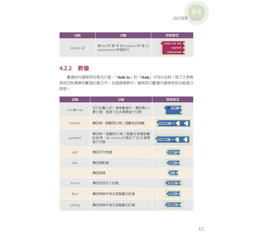 本書每章皆有範例練習,供讀者熟悉App Inventor 2的元件,應用範例包含:樂透產生機、計時器、繪本、心情塗鴉板、相片通訊錄、打魔鬼、猜牌、拼圖、地圖導航、網路佈告欄、線上音樂播放器、接蘋果遊戲等,每個範例以step by step引導讀者完成專案,相信跟著本書的引導,就算不會寫程式初學者,也可以成為App的開發人員。