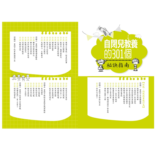 在這本《301個自閉兒教養祕訣》,融合了我自己多年來關於自閉兒在早期療育、兒童青少年心理諮商與治療、父母親職教養與校園心理諮詢等臨床實務。書中將和你分享自閉兒常面臨的8項關鍵成長議題。包括(1)刻板、局限與重複行為(2)興趣與專注(3)語言與溝通(4)情境調適(5)親師溝通與學習(6)班級經營與融合(7)遊戲與人際關係(8)同理與接納等內容。同時,提供301個問題解決策略,做為自閉兒父母在親職管教上,及老師班級經營上的參考秘訣。