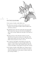 他們拿沙造房子、拿空貝殼玩耍。他們拿落葉編織成船,笑著將之放入大海。孩子們在這世界的海邊嬉遊著。