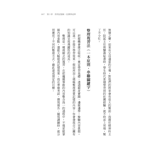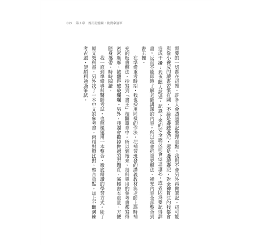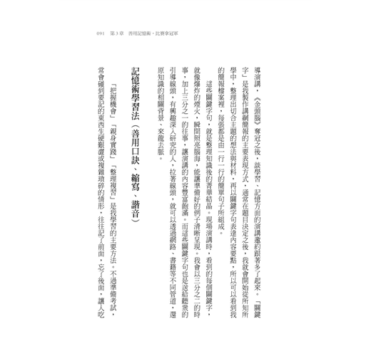 如何廣泛深刻地記憶,方法因人而異,彈性運用不同的學習方法,能達到事倍功半的效果,我也受惠於此。其中影響最深,構成一切學習基礎的核心,我稱它為「機會學習法」。把握每一個機會,只要感興趣、有時間,就不放過任何資訊,全方位地盡情吸收,更進一步說,就是以興趣一點突破,全面展開學習。