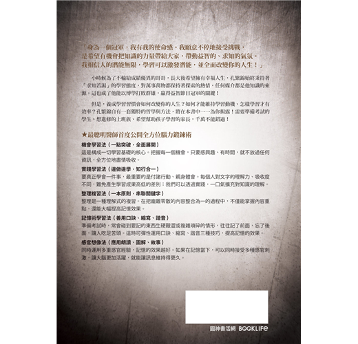 但是,養成學習習慣會如何改變你的人生?如何才能維持學習動機、怎樣學習才會有效率?孔繁錦自有一套獨特的哲學與方法,將在本書中一一為你揭露!需要準備考試的學生、想進修的上班族、希望幫助孩子學習的家長,千萬不能錯過!
