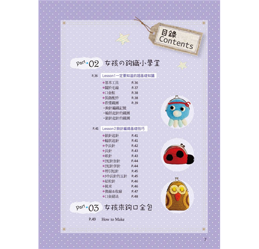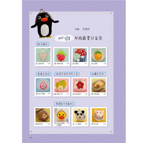 本書收錄34款造型可愛又充滿女孩氣息的鉤織口金包,從簡單基本款到可愛立體造型,款式多元繽紛。適中的尺寸剛好可以作為零錢包,或收納隨身小物、手機、化妝品等物。這些甜美可愛的口金包不需縫製裡袋,針法簡單又只要少少線材就能完成,即使是初學者也可以輕鬆享受鉤織的樂趣。只要先熟悉以短針為主的各種基礎針法,再依照詳細的編織圖和製作說明進行,很快就能完成喔!