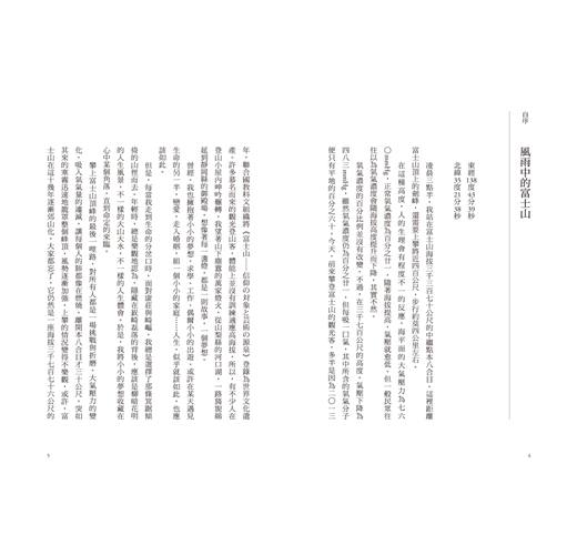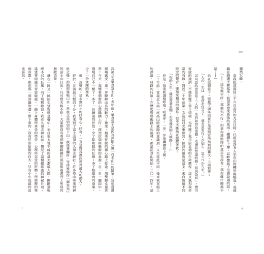 二十年前,當我走入第一座高山時就隱約意識到,人生從此不同。後來我在海上的漂浪、絲路的行旅、在歷史與藝術路上的追尋,都是從登山開始。二○一四,是我第三次攀登富士山。多年前,攀登富士是因為深田久彌「百名山」的隨筆,我想透過現場感受,進一步瞭解山岳的魅力;後來,抱著征服的雄心踏上征途,用雙腳丈量世界;今天,我懷著朝聖的心情踽踽上行,深究信仰與藝術的泉源。在一步一腳印中,發現自己不一樣了,多了一份練達的世故,少了點跋扈的狂傲;多了點眼角的滄桑,少了一份雀躍的稚氣。