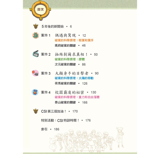 6. 每冊都有特別活動「CSI特訓時間!」,利用案件中所運用到的科學知識所設計的科學活動,讓讀者自己動手玩科學,不只好玩、有趣,更能加強學習。