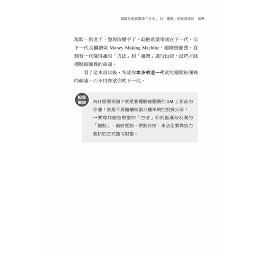 ★本書藉由「分解」現有世上數百萬個富人的投資心法,依次歸納、分類、演繹、重組其投資要訣,並採用故事、案例,用簡單的方式,幫助投資人吸收其觀念,並且加以學習、內化、實踐。