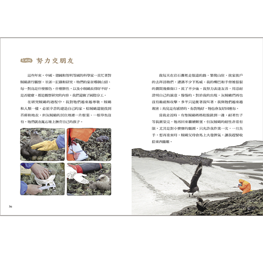 極地科學家王自磐曾到過南極11次,其中最長的一次長達兩年。他用生花妙筆和觀察入微的照片描繪了南極寶貴的企鵝和各種海鳥生態,還有第一手與這些鳥兒交朋友、互動的經驗,並記錄下了每種動物在不同時節的求偶、生養、育兒等珍貴時刻,以及不同物種的個性與習慣,風趣幽默的文字更兼具了科學知識與人性對自然的關懷,讀來彷彿這些鳥類朋友就在眼前,栩栩如生,像是含辛茹苦的超級奶爸皇帝企鵝、有會噴射便便的巴布亞企鵝、總是喋喋不休的阿德利企鵝、最厲害的空中獵手賊鷗、美得像極夜裡白色音符的雪海燕……等,牠們的存在讓南極大陸在冰雪之外,顯現出一種珍貴的溫暖生機,讓人感受到生命的活力和脈動。