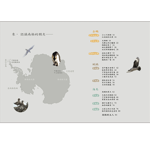 本書以鳥類為主題,娓娓敘述地球上最後一塊淨土──南極洲的故事。雖然遠在世界的盡頭,極地的鮮明景象卻自然平順地導入讀者的腦海中。相信看完此書,必能引起讀者對地球家園多一份關懷。