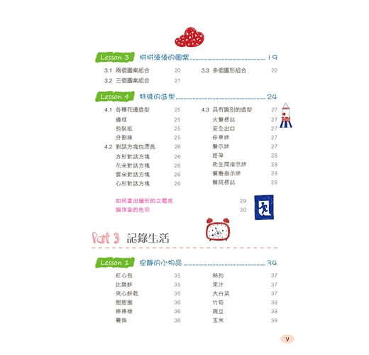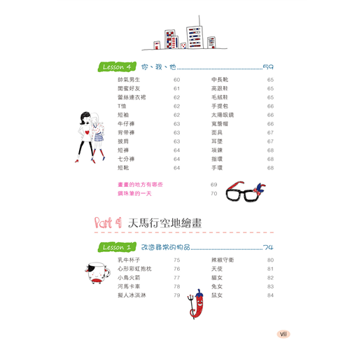 Part 3 這裡記錄了生活中的小物品,如薯條、果汁、豌豆、葡萄、抱枕、杯子、相框;各種交通工具和景觀;各種可愛的動物;鮮豔的花朵;還有身邊小夥伴的時髦裝扮。掌握了這些物品的繪製,你就可以隨時隨地記錄生活了。