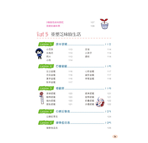 Part 5 在這一部分裡,三色鋼珠筆將讓你的生活更加多姿多彩,繪製日記本中的各種插圖、造型各異的書籤、最具創意的便籤、健康的食譜,或者做一個屬於自己的日曆記事表格讓創意無處不在。