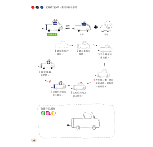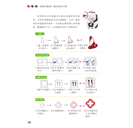 Part 4 這一部分的標題,叫做「天馬行空地繪畫」。透過前面的學習,你已經完全掌握了使用三色鋼珠筆繪製生活中的事物,接下來就要發揮你的想像力,進入鋼珠筆的創意塗鴉之旅了。將杯子畫成乳牛杯子、把河馬變成卡車、畫畫童話故事中的人物、把雜亂的房間佈置得溫馨雅致,還可以讓自己扮演成廚師,讓廚房裡的一切躍然紙上。