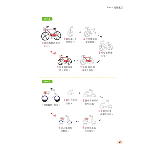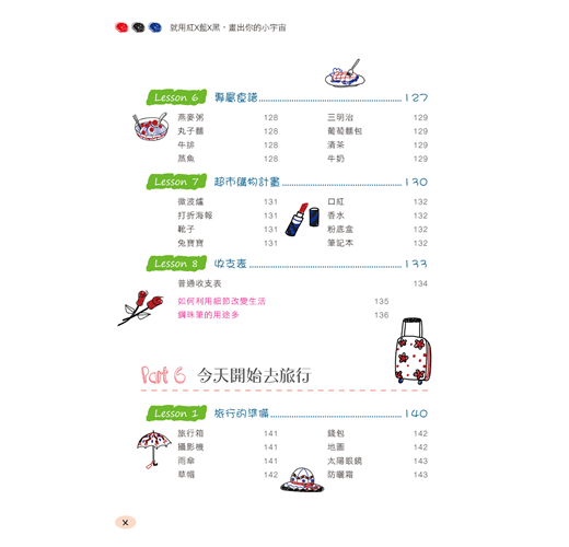 Part 6 這裡將開始用三色鋼珠筆記錄你的旅行了。把旅行中的各種裝備、行程中的必需品、行程規劃都畫出來,還可以製作手繪地圖、記錄名勝古蹟,或者分享旅行中的點點滴滴。