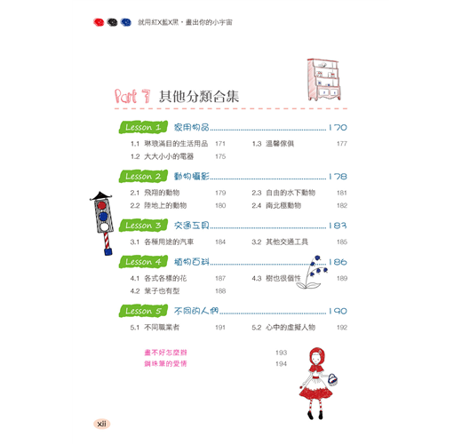 Part 7 我們生活在一個多姿多彩世界裡,每天有各種各樣的事物映入眼簾。在這一部分,根據家用物品、動物、交通工具、植物、人物進行有限的分類,提供大量的案例供讀者參考,希望可以幫助你打開思路,描繪更多美好的事物。