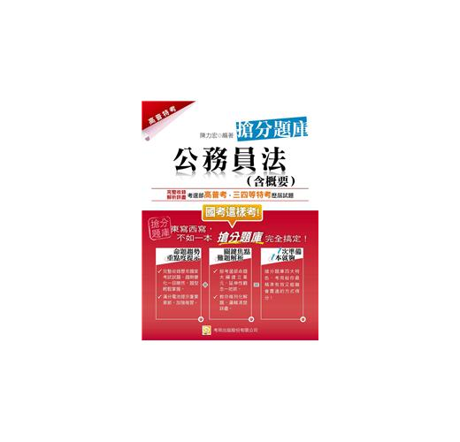 為協助考生在「公務員法」這門科目獲得高分,解題除了力求清楚、詳盡,技巧更是力求適用、易懂。讀者亦請搭配考用出版之《絕對制霸 公務員法(含概要)》一書,藉上榜關鍵的呈現方式與搶分題庫融會貫通,提升自我戰鬥能力,一戰而勝!