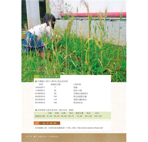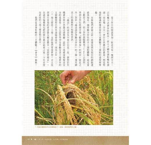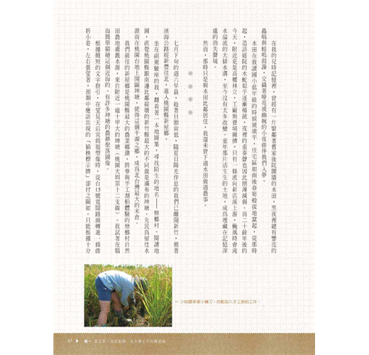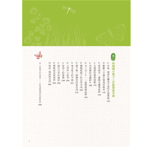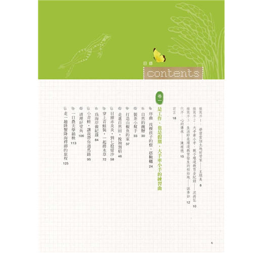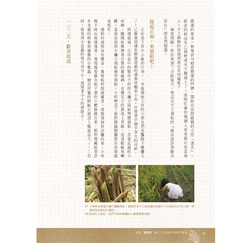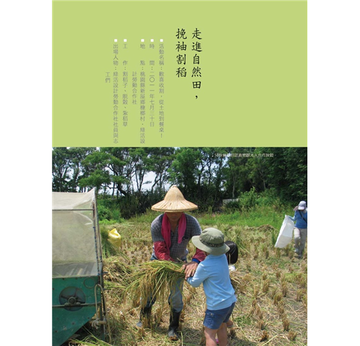 春分:體驗插秧的新奇;大暑:走進自然田歡喜收割;處暑:到七股海岸留沙;入秋:大山背上帶青蛙過馬路……孩子跟隨大人的身影,用行動守護環境,並將獲得的生態知識融入日常生活裡。此外,作者也在孩子就讀的小學推動親子工作假期,和熱情參與的志工家庭一起建構並悠游在離家不遠的生態樂園!