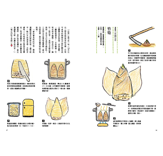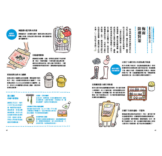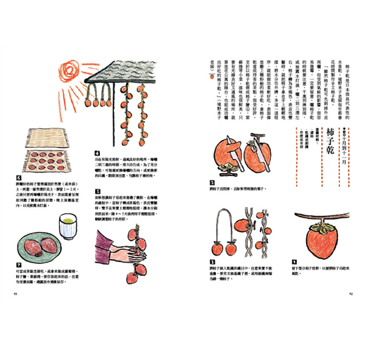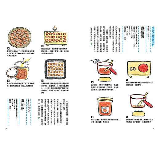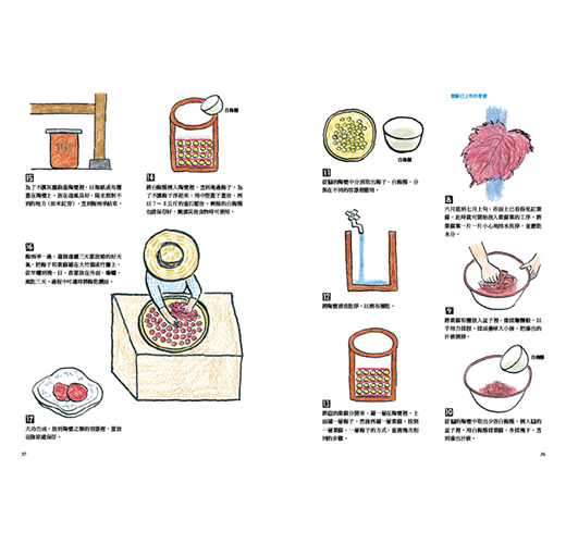 翻開書頁,占去半幅頁面以上的手繪質樸彩圖簡單易懂,給人一種安心感。譬如說,「澤庵醃蘿蔔」這道菜,從曬蘿蔔的方法開始、到米糠醃床的製作手法都仔細解說。每道料理都皆依步驟順序畫出,只要照著做,就能輕鬆做出富含季節感的漬物料理。初學者也能輕鬆上手,為餐桌增添四季風味。除了料理食譜之外,也收錄了「防潮防霉對策」、「秋天通風防蟲對策」等,讓人能在生活中簡單實行的實用小撇步。──日本讀者