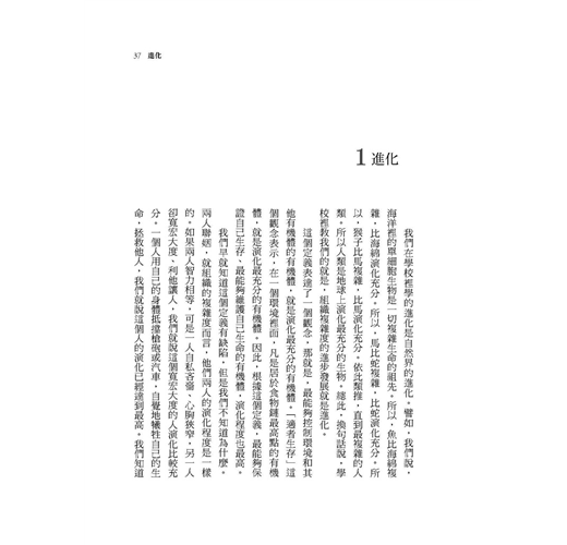 我們在學校裡學的進化是自然界的進化。譬如,我們說,海洋裡的單細胞生物是一切複雜生命的祖先。所以,魚比海綿複雜,比海綿演化充分。所以,馬比蛇複雜,比蛇演化充分。所以,猴子比馬複雜,比馬演化充分。依此類推,直到最複雜的人類。所以人類是地球上演化最充分的生物。總此,換句話說,學校裡教我們的就是,組織複雜度的進步發展就是進化。