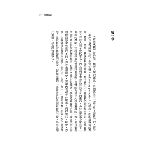 本書要講的就是獲得真實的力量──人格與靈魂的銜接,還有這種銜接涉及什麼東西,如何發生,又創造了什麼東西。要了解這些事情,首先要了解那些五官人看來很不尋常的東西。你一旦了解進化──五官知覺是走向多官知覺的旅程,了解自己不會永遠停留在五官階段,這些東西就變得非常自然。