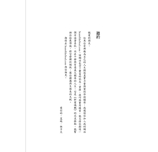 下次當你悲傷、難過、憤怒、嫉妒、不平的時候,安靜一下,讓那你平常就在培養的愛來做他能做的事。不要選擇繼續做出憤怒的行為,而選擇做出愛。如果做不到,就靜靜的坐一下,沈澱一下,翻翻手上穿梭著正向能量的好書,舒緩一下情緒,也許,這就是愛的行使,選擇做出愛的表現。延續當年老先生對我說的那句話:「希望你會喜歡這本書!」