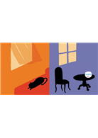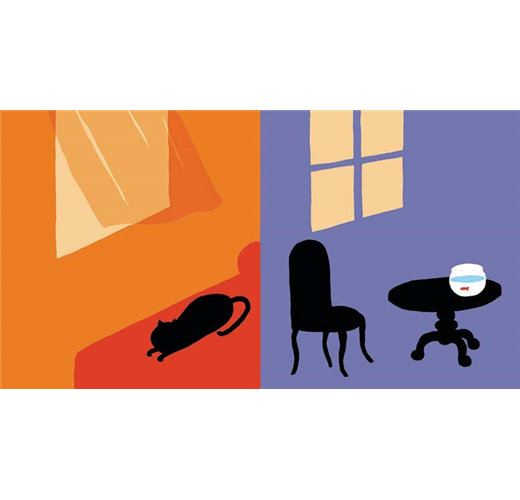 貓咪在黃橙色的房間裡休息,金魚則在藍紫色的客廳裡,在玻璃缸中游著。
