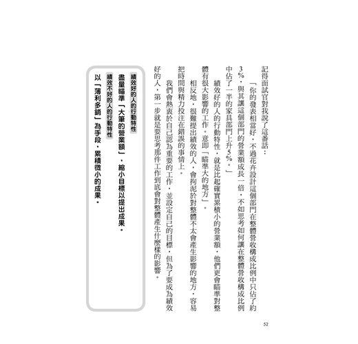 因此,首先要做的,不是要突然模仿績效好的人的行動特性,而是要知道自己無法產生績效的行動特性。