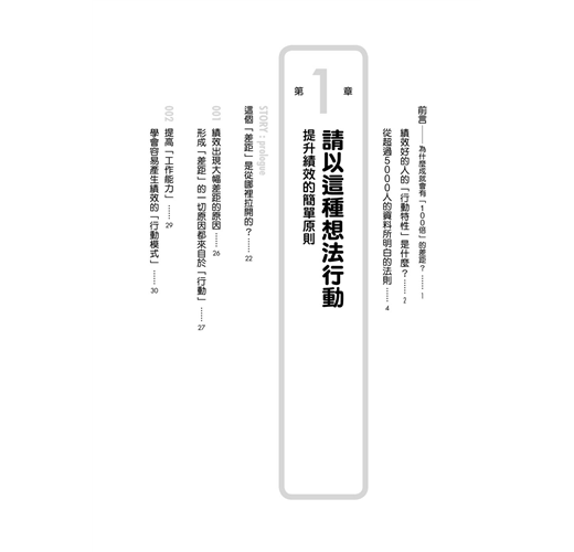首先,績效不好的人必須先接受的,就是「就算和領先集團的人花同樣的時間,所產生的績效也會有很大的差距」這樣的現實,以及「其原因皆來自於一個『行動』」這件事。