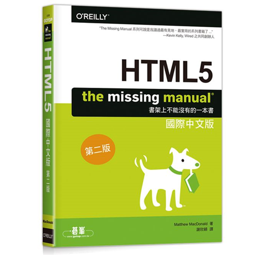 HTML5不僅是一種標記語言,更是多種網頁標準的集合。幸運的是,本書涵蓋了所有你所需要知道的一切!藉由循序漸進的講解說明,配合實務範例演練 HTML5: The Missing Manual 將示範如何應用視訊工具(video tools)、動態影像(dynamic graphic)、離線功能(offline features),以及自適應網頁配置(responsive layouts)來建置適用於行動裝置(mobil devices)的網頁應用程式(web apps)