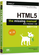 HTML5不僅是一種標記語言,更是多種網頁標準的集合。幸運的是,本書涵蓋了所有你所需要知道的一切!藉由循序漸進的講解說明,配合實務範例演練 HTML5: The Missing Manual 將示範如何應用視訊工具(video tools)、動態影像(dynamic graphic)、離線功能(offline features),以及自適應網頁配置(responsive layouts)來建置適用於行動裝置(mobil devices)的網頁應用程式(web apps)