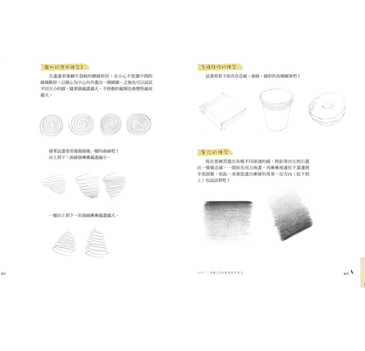 書裡設計成從最簡單的杯子開始,到複雜的咖啡店風景等,包含了各種難易度的素材。