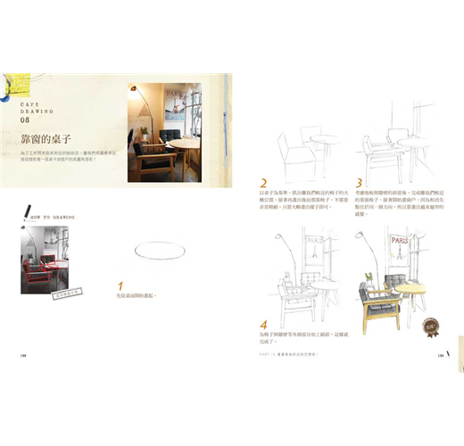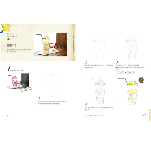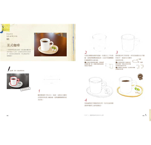 書裡設計成從最簡單的杯子開始,到複雜的咖啡店風景等,包含了各種難易度的素材。每一篇都先讓大家了解這個東西是由哪些基本圖形所組成的,再教導如何抓出大致的樣子,最後加上細節,以這樣的順序做簡單明瞭的說明。另外,除了鉛筆線條之外,想要為圖畫加上色彩的話,也可以參考最後的圖片,試試用色鉛筆輕輕地著色。