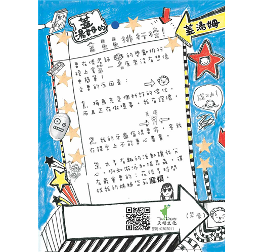 超級會找藉口的蓋湯姆,放個一個暑假之後,找藉口功力好像變得更高段了!收到老師最後通牒,情急之下,他竟然抄了書封底上的文字,獲得老師大大的稱讚。但是,要這麼順利闖關當然是不可能的事情!