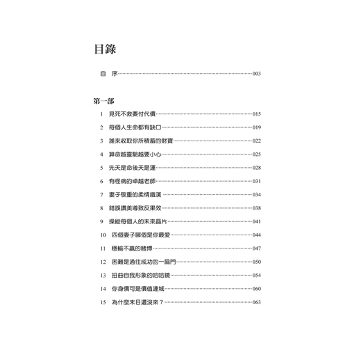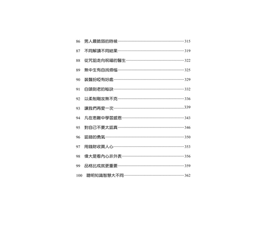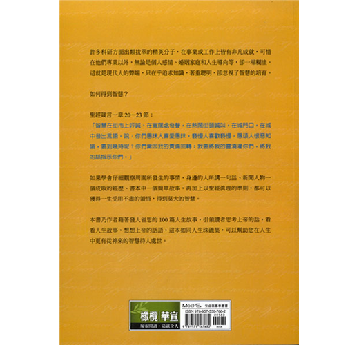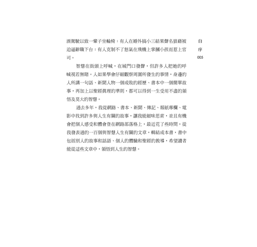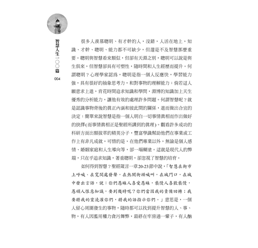 過去多年,我從網路、書本、新聞、傳記、報紙專欄、電影中找到許多與人生有關的故事,讓我能細味思索,並且有機會把個人感受和體會登在網路部落格上,最近花了些時間,從我發表過的一百個與智慧人生有關的文章,輯結成本書,書中包括別人的故事和話語、個人的體驗和聖經的教導,希望讀者能從這些文章中,領悟到人生的智慧。