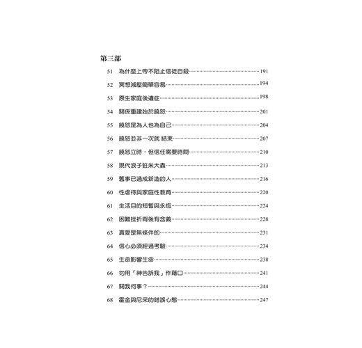 《我為什麼是我》(2001年)、《有傷害,沒傷痕》(2008年)、《婚姻,可以很幸福》(2009年)、《有傷害,沒傷痕。小組手冊》(2010年)、《教養兒女GPS:掌握黃金十年的教養指南》(2011年)、《教養兒女GPS小組手冊》(2012年)、《婚姻,可以很幸福小組手冊》(2013年)、《做個大丈夫:男子漢成長祕笈》(2014年)(以上均由橄欖出版)