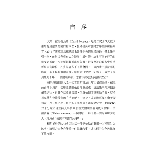大衛.彼得雷烏斯(DavidPetraeus)是第二次世界大戰以來最有威望的美國四星軍官,曾擔任美軍駐阿富汗部隊總指揮官,2011年獲歐巴馬總統提名出任中央情報局局長,但上任不到一年,就被揭發與有夫之婦發生婚外情,結果不但美好的形象受到破壞,多年婚姻關係出現危機,最後也被迫辭去中央情報局崇高職位。許多記者私下不禁會問,一個如此出類拔萃的將領,手上握有軍中高權,威信如日當空,卻爲了一個女人得到如此下場,一個聰明將領,怎會作出這麼愚蠢的決定?