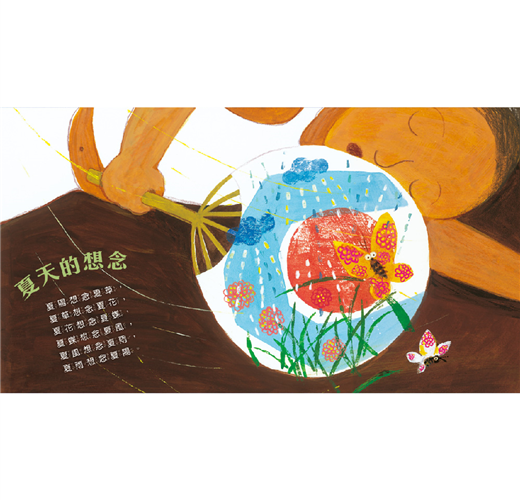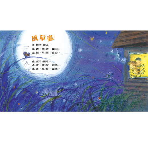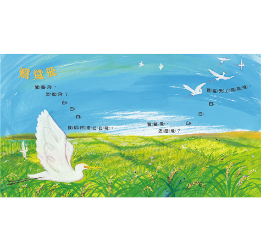 以圖為大地,文字是路,孩子循著文字的指引和線索,展開了這場大自然的語文遊戲囉!「小露珠,紅花上的小露珠,白牆邊的紅花上的小露珠……」,反覆念誦語句,累加出小露珠從出現到掉落摔碎的自然情趣,原來自然微小的美,卻有著意想不到的驚喜;「夏陽想念夏草,夏草想念夏花,夏花想念夏蝶……」,像玩接龍遊戲一樣,說出了自然萬物對夏天的想念,是那麼美好卻又令人不捨;又如問大自然「什麼是愛?」,在一問一答、你說我猜中,將抽象的愛,溫柔的告訴孩子;四季的變化總是那麼快,循環一輪就是一年,把文字排列成圈狀的迷宮,正著讀、反著讀,道出了每一個季節的綺麗景色;而高高飛、低低飛的白鷺鷥,以圖像寫詩,排出了「詩中有畫、畫中有詩」的景象,讓人充滿了無限的想像。