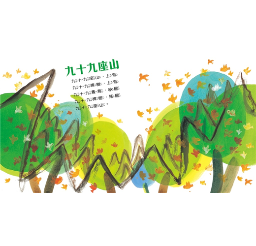 《九十九座山》以語文的創意為起點,將語文的形式特色融入在每一個自然片段裡,一同邀請你和孩子在音韻優美、生動有趣的念唱中,領略中文獨有的音韻與文學之美!